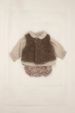 This newborn vest is made from super warm sherpa knit virgin wool, providing a plush and cozy feel. It features a round neckline with two front buttons for easy dressing. The vest has a mélange effect and is fully lined with contrasting textured fabric for added comfort and warmth.