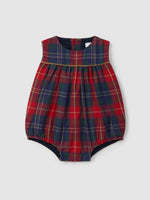 A beautifully crafted romper in 100% soft cotton, featuring a delicate check pattern and a contrasting decorative ribbon detail across the chest. Thoughtfully finished with mother-of-pearl Laranjinha buttons at the back and discreet press fastenings between the legs for ease and comfort.