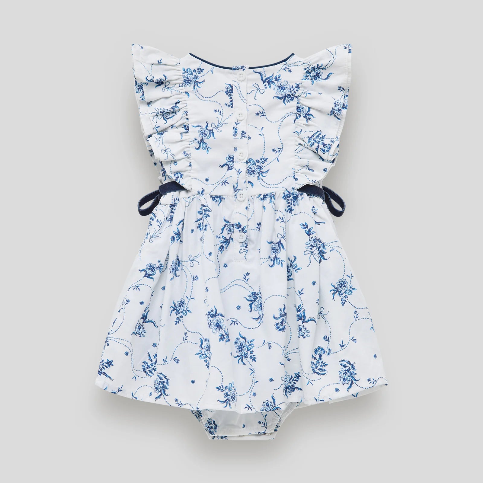 Unit price / perThis 'Frill Sleeve Romper Dress' in Little Harry Hampton's exclusive 'Bows in the Garden print' combines charm and comfort. Made from soft 100% cotton sateen with velvet ties, contrast neck binding, and custom back buttons, it’s designed for effortless style and all-day ease.