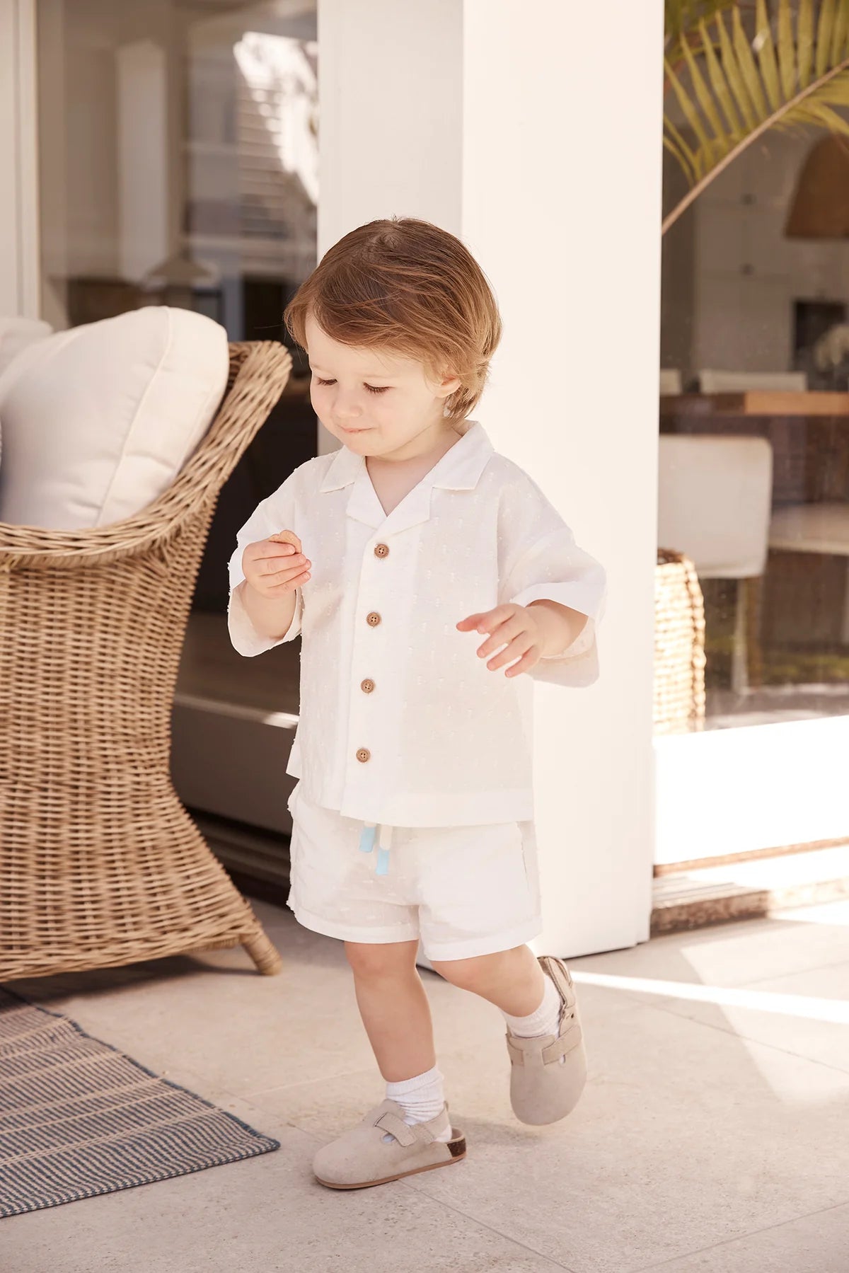This is the ultimate unisex button-up resort shirt, designed to perfectly complement the matching shorts. Made from the softest 100% cotton dobby fabric, this shirt is a summer must-have for your little one’s wardrobe.
