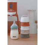 A handy container for formula or snacks on the go. It features three stackable sections, a covered spout for easy pouring, and a silicone handle for attaching to your bag.